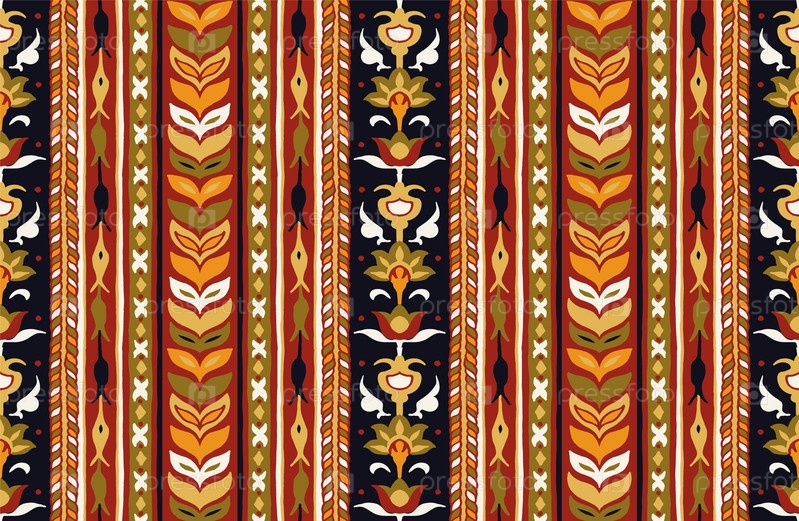Геометрический дамасский орнамент. Икат границы. Этническая вышивка с листьями и монограммами. Племенная векторная текстура. Бесшовный народный узор в ацтекском стиле. Индийский, скандинавский, цыганский, мексиканский, африканский ковер