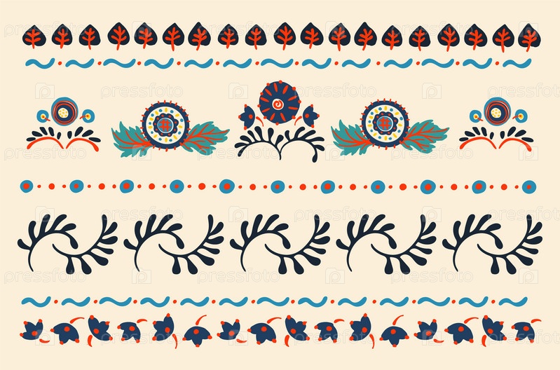 Набор этнических элементов. Бордюр представляет собой полосу с цветами, листьями, ветками, вензелями. Народная вышивка. Славянский, украинский, русский мотив. Хохлома, матрешка, дымковская игрушка. Мексиканский, индийский, цыганский ковер. Вязаное кружево