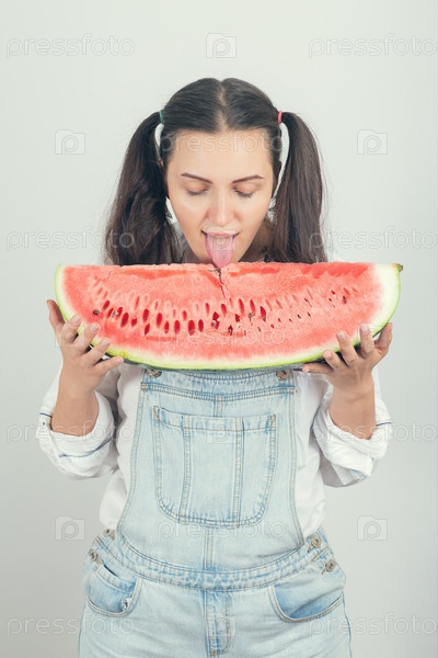 Девушка ест арбуз