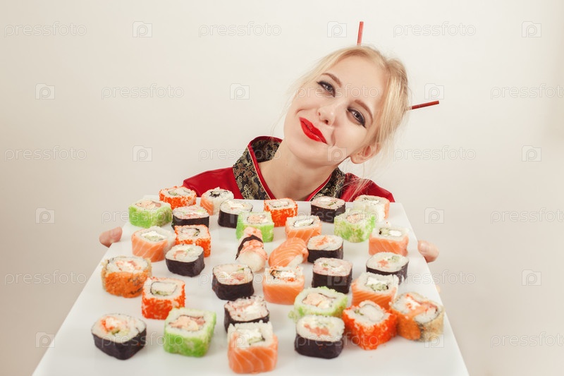Девушка дарит суши