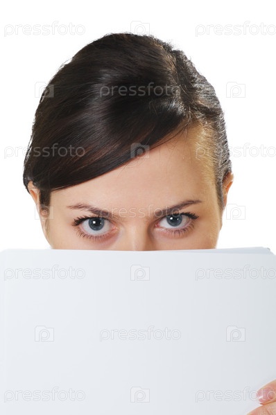Девушка выглядывает из-за бумаги