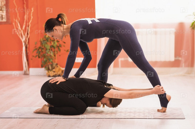 Брюнетка, преподаватель универсальной йоги, выполняет тяговое вытяжение позвоночника ученику в детской позе, баласане. Техника улучшения осанки