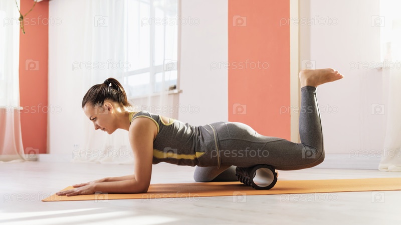 Женщина в спортивной одежде на коврике выполняет миофасциальный массаж бедра валиком, восстановление мышц после травм