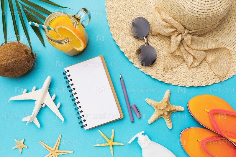 Блокнот с местом для копирования текста рядом с игрушечным самолетом и различными аксессуарами для отдыха на синем фоне, летний фон