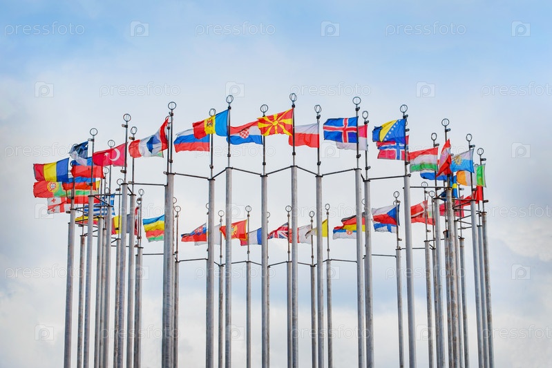 Флаги европейских государств на флагштоках на фоне облачного неба