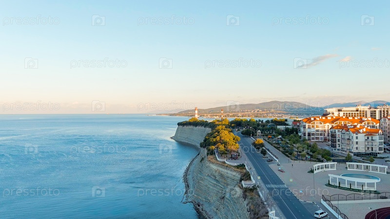 Геленджик, Россия. Маяк на берегу мыса Толстого. Геленджикская бухта, вид с воздуха