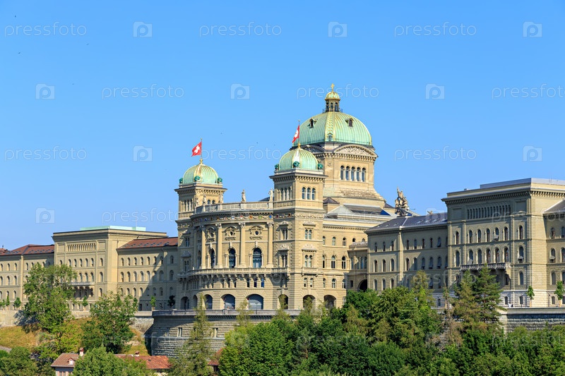 Берн, Швейцария.Bundeshaus - Федеральный дворец.Фасад с официальными гербами регионов