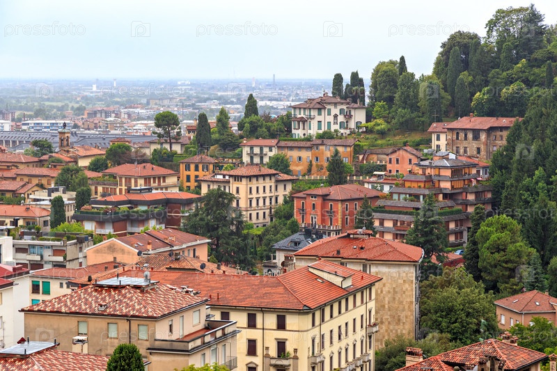 Бергамо, Италия. Исторический центр Бергамо, вид на крыши. Дождливая погода