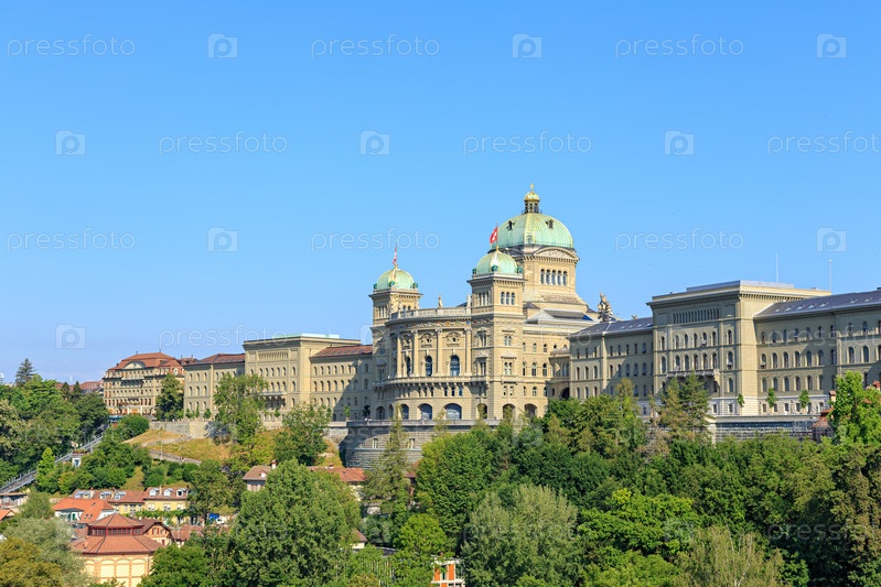 Берн, Швейцария.Bundeshaus - Федеральный дворец.Фасад с официальными гербами регионов