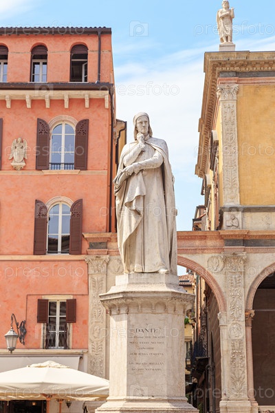 Верона, Италия. Данте Алигьери (1265-1321) — писатель, поэт и политик, родившийся во Флоренции, Алиджеро ди Беллинчоне. Его мраморная статуя, выполненная в 1865 году Хьюго Дзаннони (1836 - 1919)