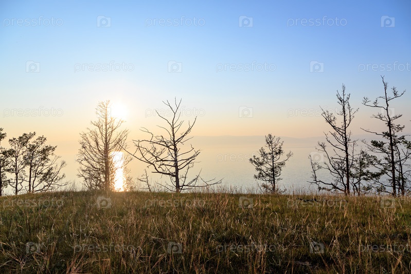 Заходящее солнце за ветвями деревьев над заливом Малого Байкала. Россия, остров Ольхон