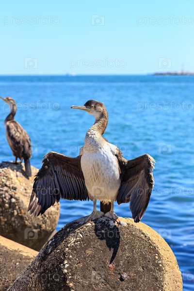 Венеция, Италия. Баклан сушит крылья на волнорезе