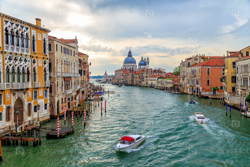 Венеция, Италия. Движение на Большом канале утром. Купол базилики Санта-Мария-делла-Салюте