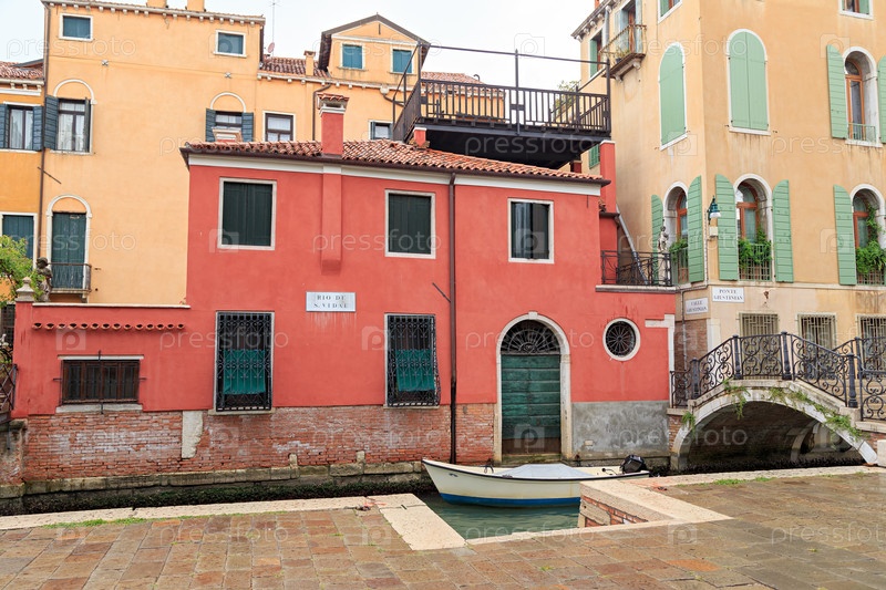 Венеция, Италия. Канал Рио-ди-Сан-Видаль с лодкой и мостом Понте Джустиниан. На табличках географические названия местности