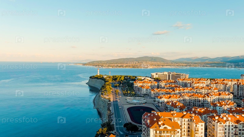 Геленджик, Россия. Маяк на берегу мыса Толстого. Геленджикская бухта, вид с воздуха