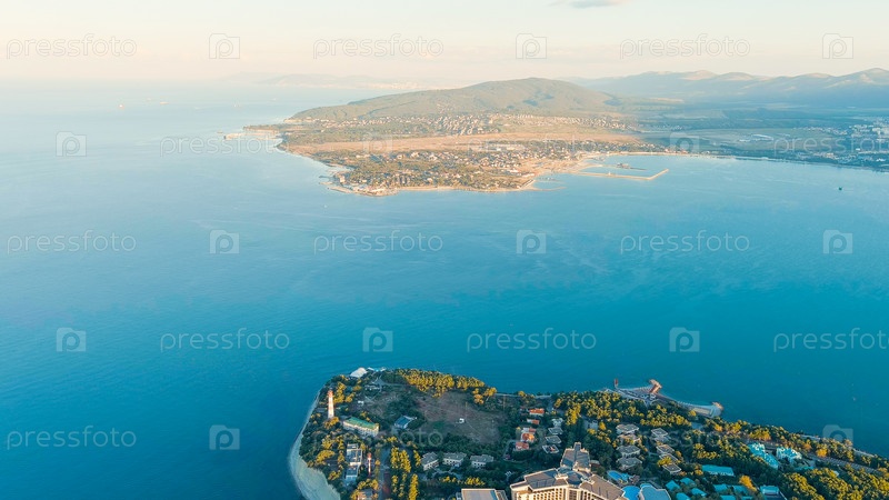 Геленджик, Россия. Маяк на берегу мыса Толстого. Геленджикская бухта, вид с воздуха