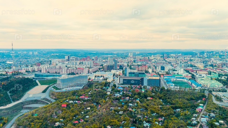 Уфа, Россия. Панорама центральной части города Уфы. Время после захода солнца, вид с воздуха