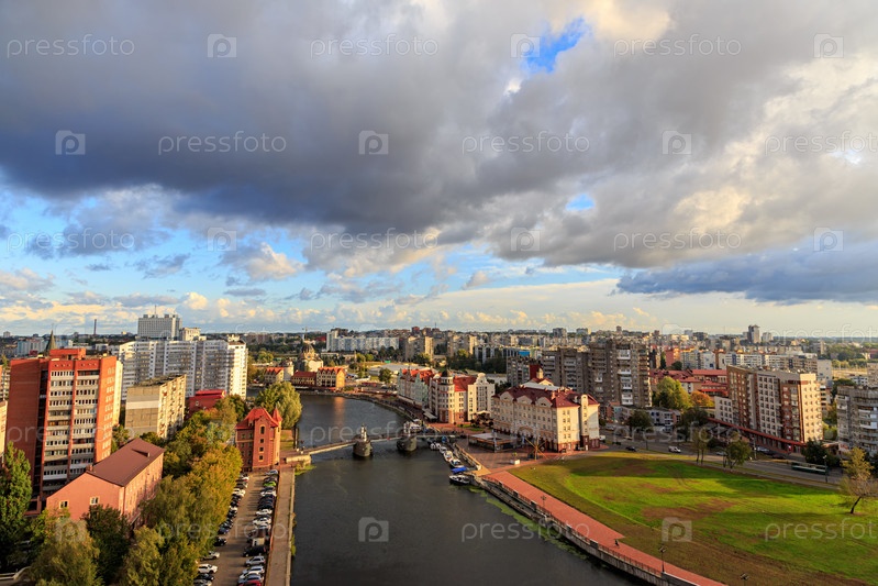 Пасмурная погода в Калининграде. Река Преголя, набережная Рыбной деревни и Юбилейный мост. Россия, Калининград