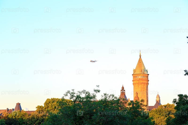Люксембург город, Люксембург. Самолет заходит на посадку на фоне Банковского музея Люксембурга