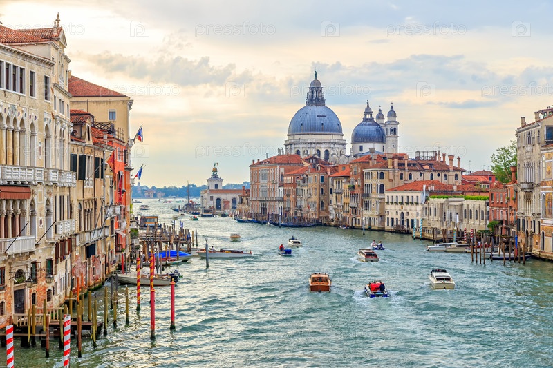 Венеция, Италия. Движение на Большом канале утром. Купол базилики Санта-Мария-делла-Салюте