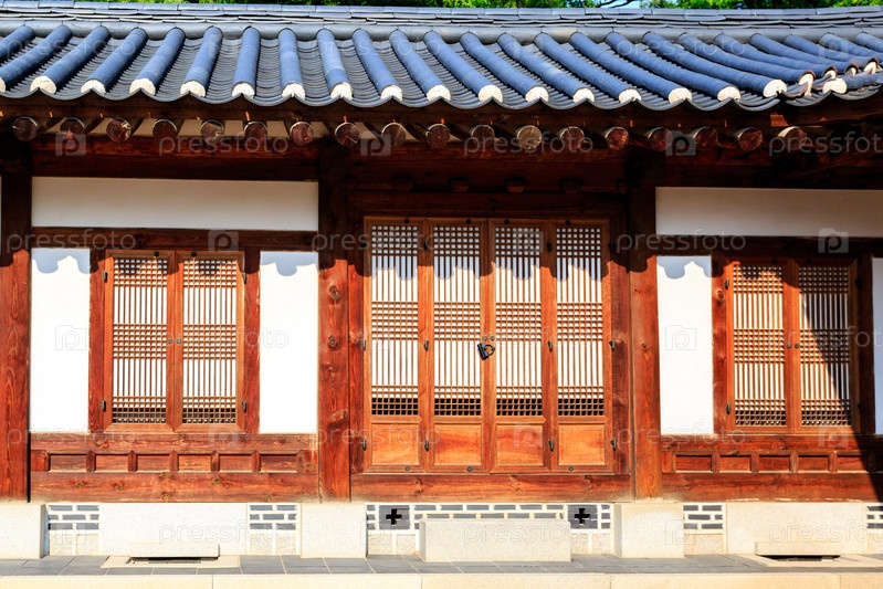Традиционная корейская архитектура, каменная стена с деревянной дверью во дворце Кенбоккун, Сеул, Южная Корея