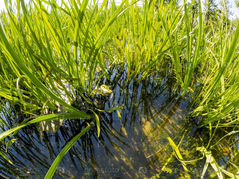 Сочная зеленая трава возле небольшого пруда в солнечный день