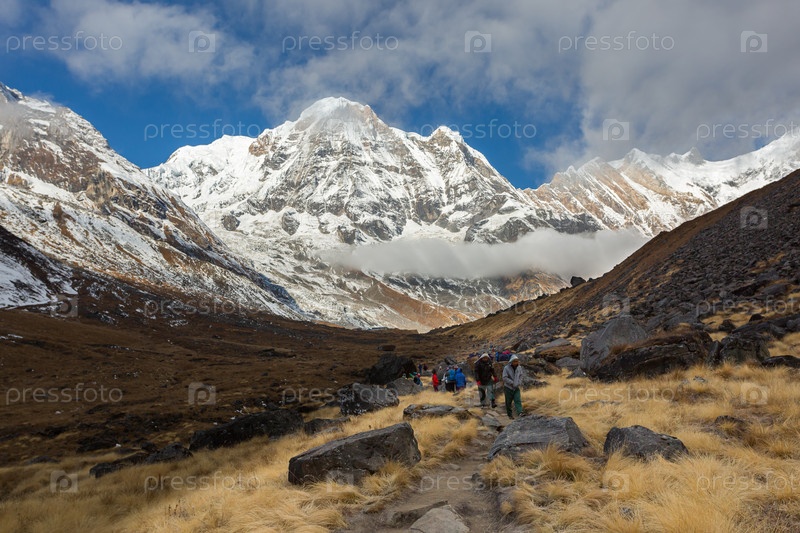 Туристы идут вверх по пути к базовому лагерю Аннапурны, Гималаи, Непал
