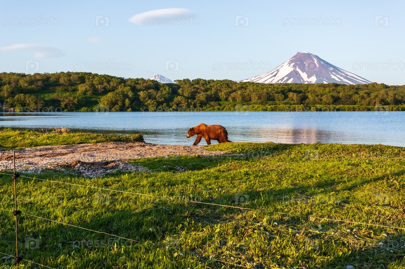 Бурый медведь гуляет у Курильского озера на фоне вулкана Ильинский. Камчатка, Россия