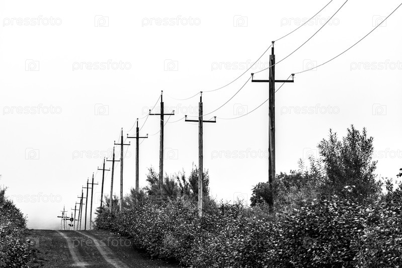 Старые деревянные линии электропередач, черно-белое изображение. Полуостров Камчатка, Россия