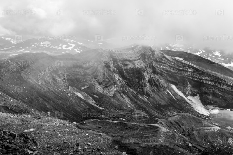 Кальдера вулкана Горелый в пасмурную погоду, Камчатка, Россия. Черно-белое изображение