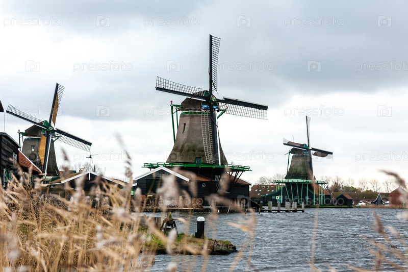 Ветряные мельницы в деревне Заансе Сханс в пасмурный осенний день, Нидерланды