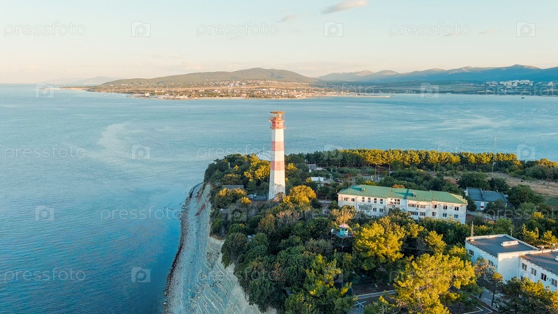 Геленджик, Россия. Маяк на берегу мыса Толстого. Геленджикская бухта, вид с воздуха