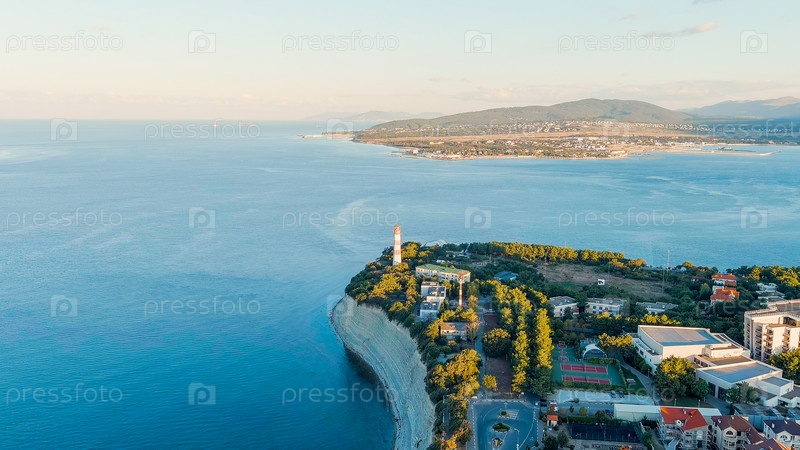Геленджик, Россия. Маяк на берегу мыса Толстого. Геленджикская бухта, вид с воздуха