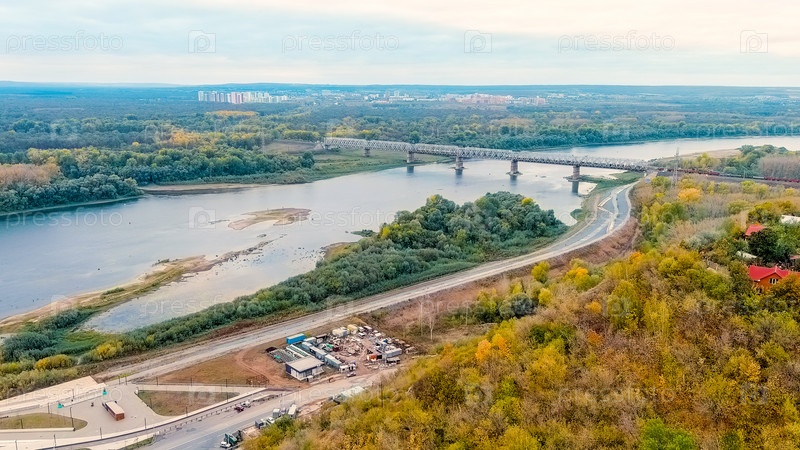Уфа, Россия. Железнодорожный мост через реку Белую. Поезд следует по мосту, вид с воздуха