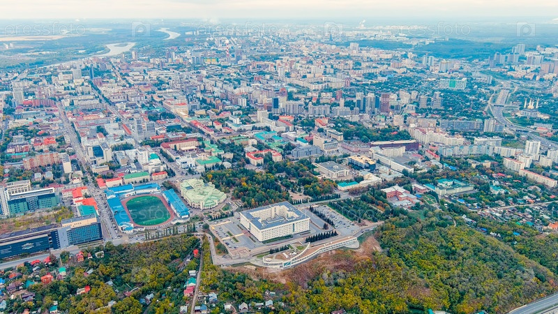 Уфа, Россия. Панорама центральной части города Уфы. Время после захода солнца, вид с воздуха