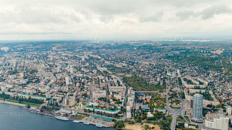 Саратов, Россия. Панорама города Саратова в пасмурную погоду, вид с воздуха