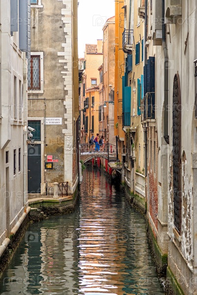 Венеция, Италия. Узкий пустой канал Рио-ди-Сан-Сальвадор. Мост любви. На табличке географическое название местности