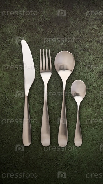 Нож, ложка, вилка, чайная ложка лежат в ряд на темно-зеленом текстурированном столе