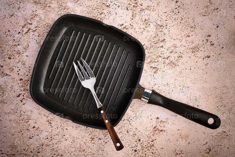 Сковорода для гриля и стальная вилка для мяса лежат на светлом бетонном фоне, вид сверху