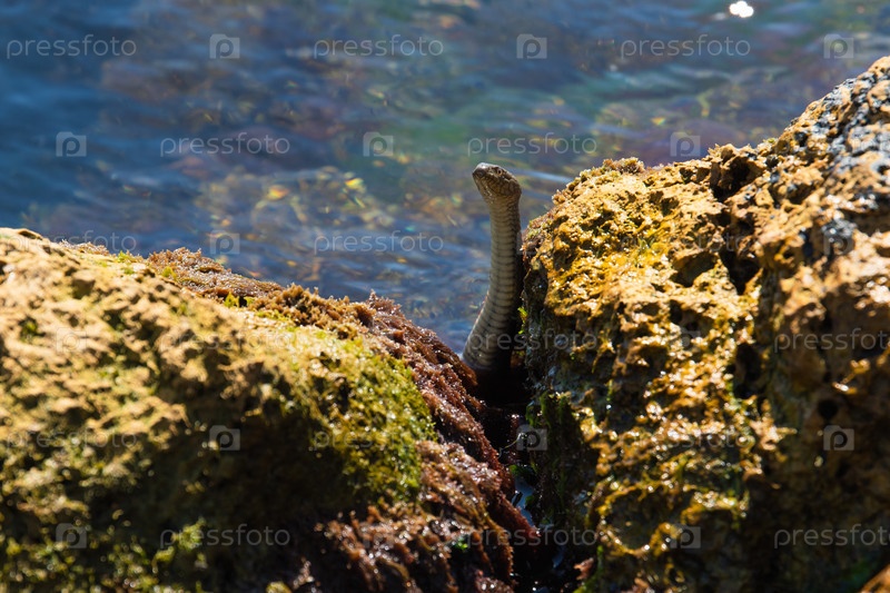 Голова змеи выглядывает из морской воды. Рядом огромные камни. Морпех уже в Азовском море. Сосредоточение внимания на змее