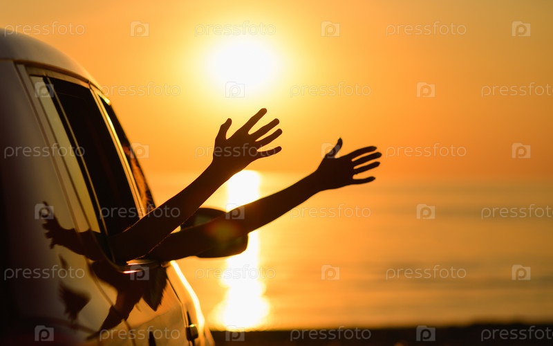 Машина стоит на берегу на закате. Две руки путешественников машут на фоне солнца и моря. Концепция семейной поездки на море