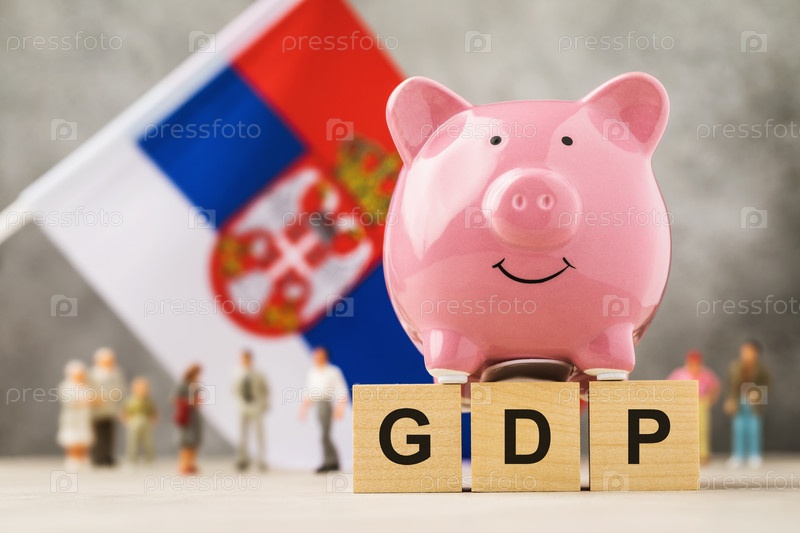 Копилка, деревянные кубики с текстом, игрушечные человечки из пластика и флаг на абстрактном фоне, концепция на тему ВВП Сербии