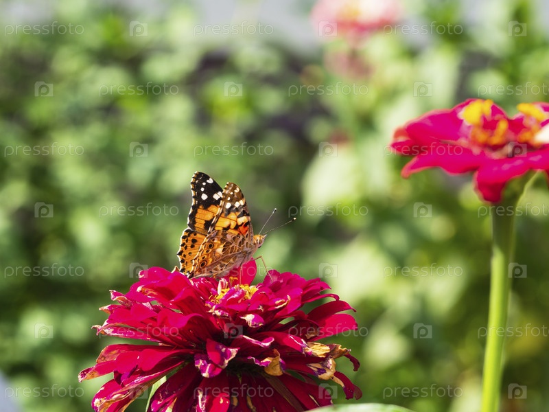 Бабочка на цветке. Красивый естественный фон с красными цветами на зеленом летнем лугу и красивая бабочка, сидящая на цветке при ярком солнечном свете