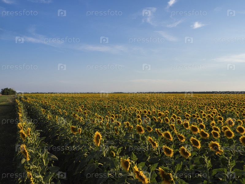 Голубое небо с белыми перистыми облаками над желто-зеленым полем цветущих подсолнухов
