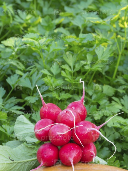 Пучок свежей красной спелой редьки (рафана), собранной на экологически чистой грядке. Крупный план весеннего овоща на фоне зелени петрушки. Органическое сельское хозяйство, здоровое питание