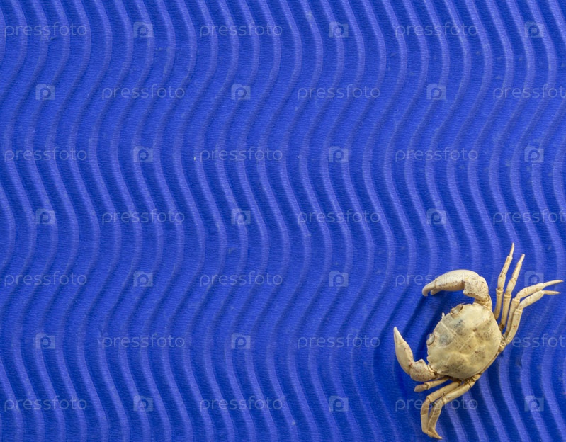 Синий фон. На голубом текстурированном листе волны лежит сухой краб