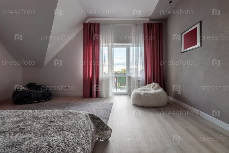 Красивый дизайн интерьера современной и уютной спальни с розовыми подушками и шторами