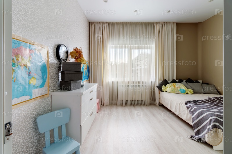 Детская комната с розово-голубым стулом, окном и картой на стене