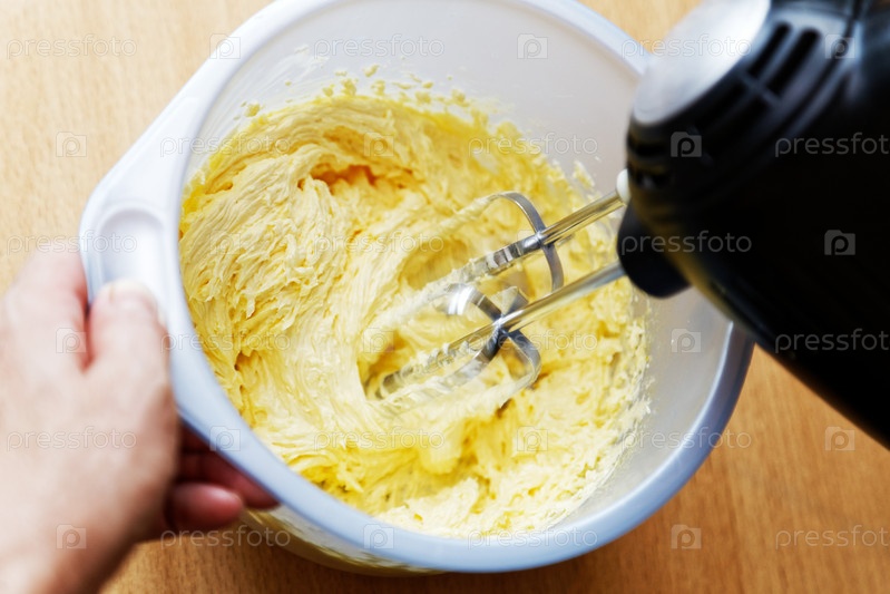 Приготовление взбитых сливок крупным планом с помощью электрического миксера