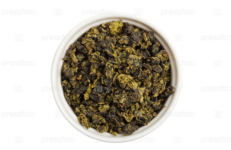 Сухие листья чая в белой керамической миске, изолированные на белом фоне